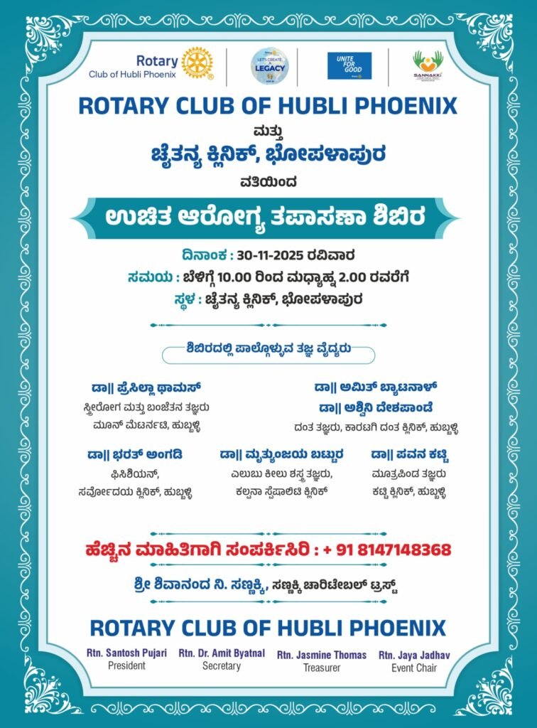 The Rotary Club of Hubli Phoenix, in association with Chaitanya Clinic, Bhojanalapura, is conducting a Free Health & Wellness Check-Up Camp on 30th November 2025, between 10:00 AM and 2:00 PM.